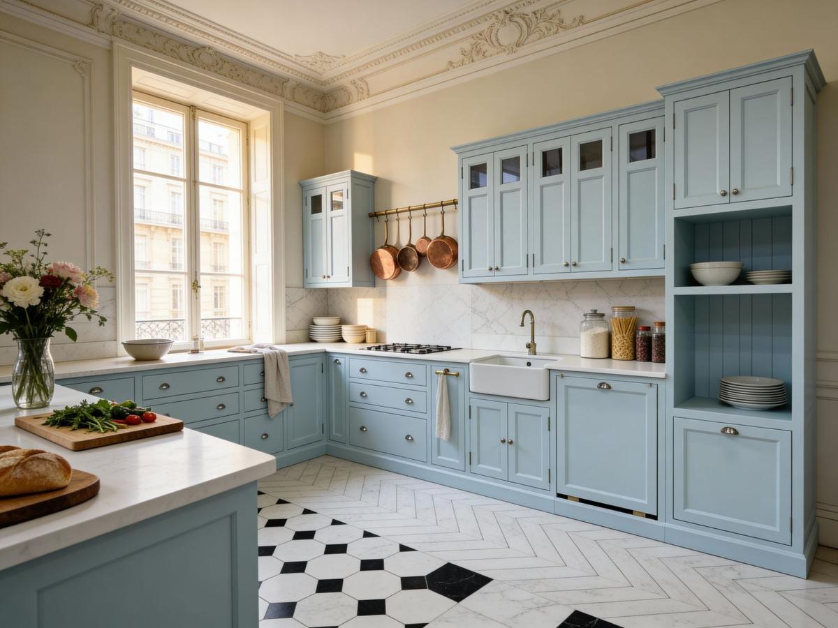 Cette configuration présente une teinte bleu Farrow & Ball, raffinée et profonde, associée à un plan de travail en quartz blanc pour un contraste lumineux et harmonieux.
