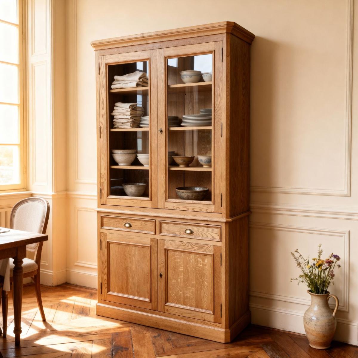 Petit vaisselier  HAMPTON  en chêne Massif de style Campagne Chic Classique comportant 2 portes vitrées et 2 tiroirs et 2 portes pleines .